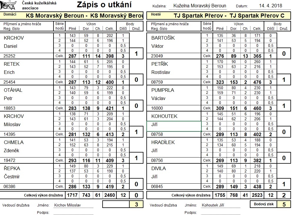 Krchov Miloslav - Kohoutek Jiří 413:402