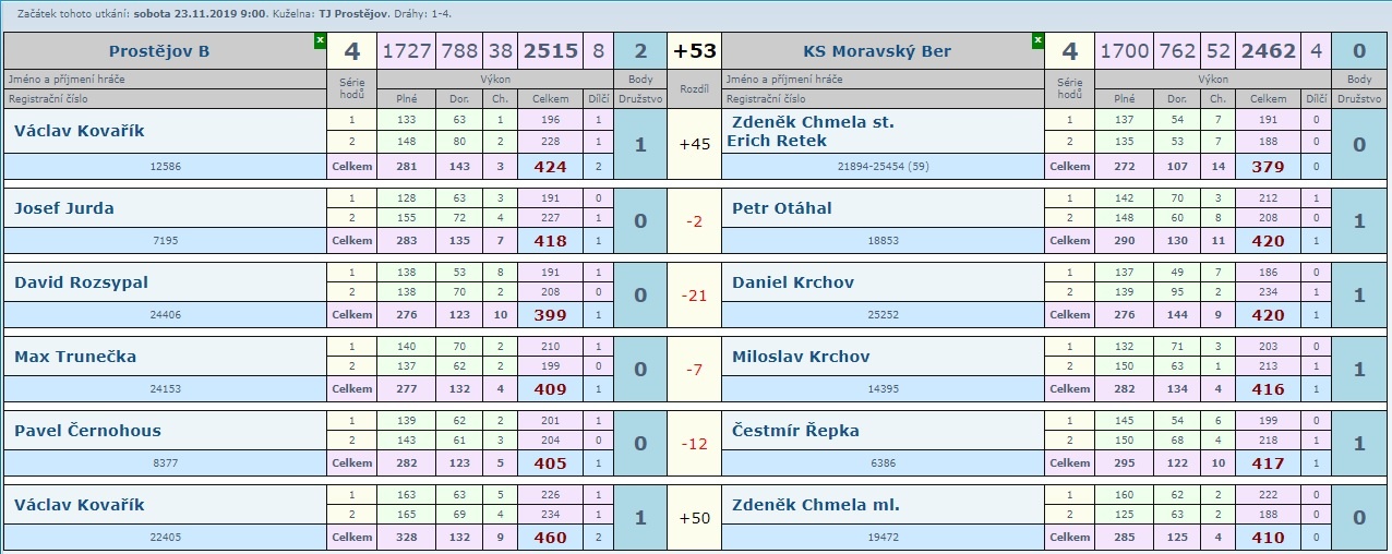 Václav Kovařík 424:379 Zdeněk Chmela st.- Erich Retek