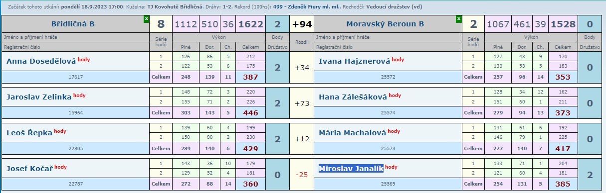 Anna Dosedělová 387:353 Ivana Hajznerová